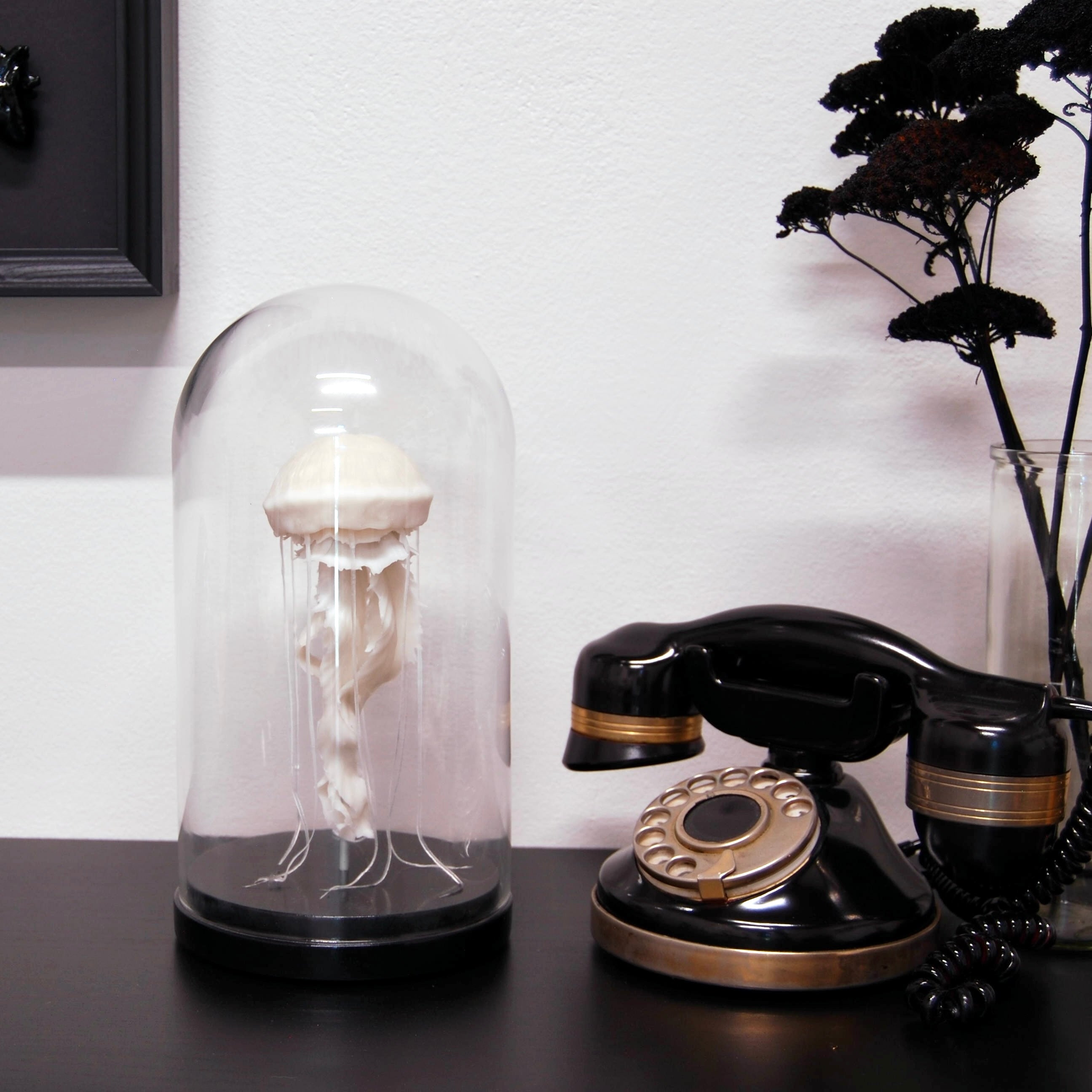 Bianco porcellana, essenziale ed elegante: il teschio diventa un emblema di luce e ombra, sospeso tra fragilità e trascendenza.