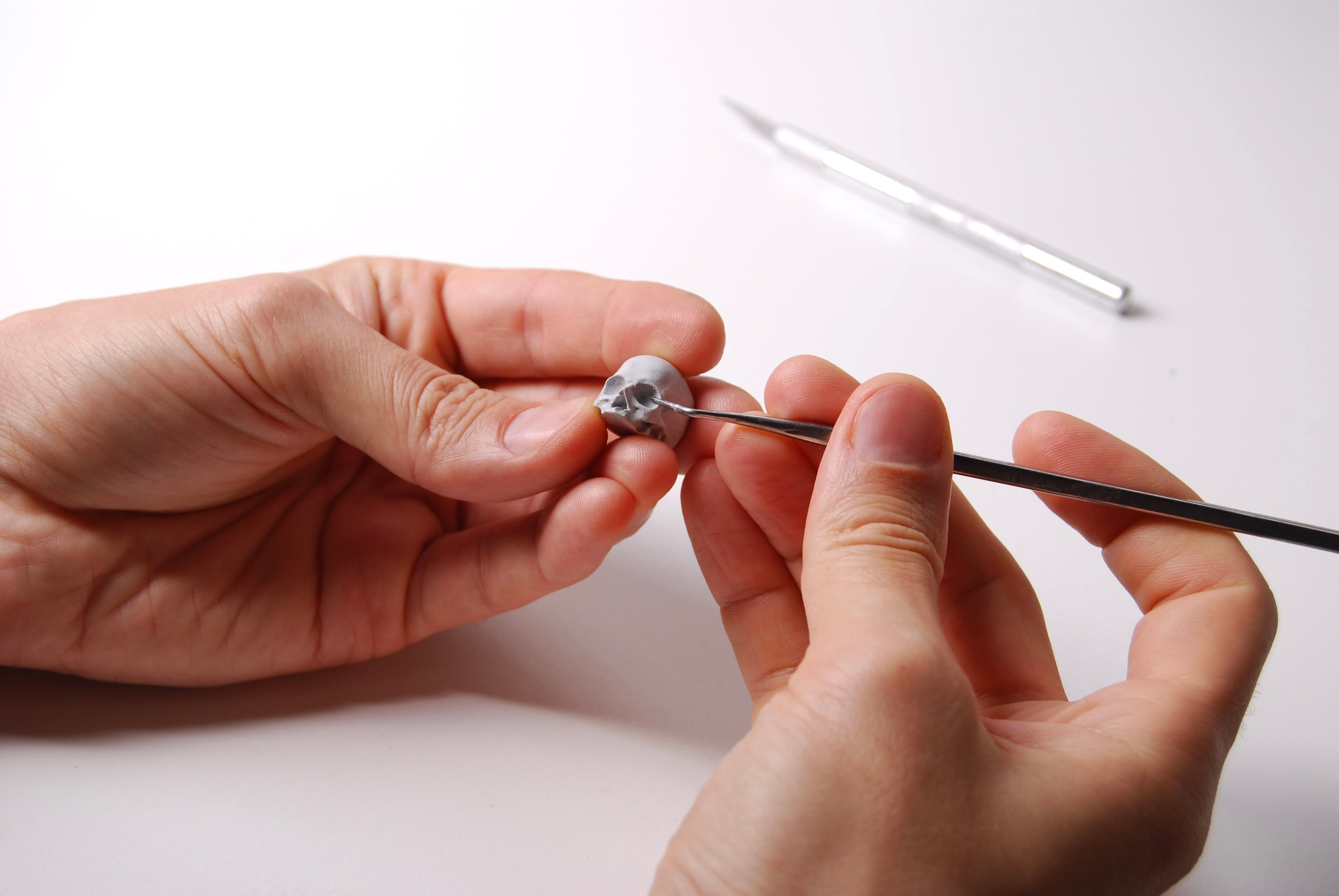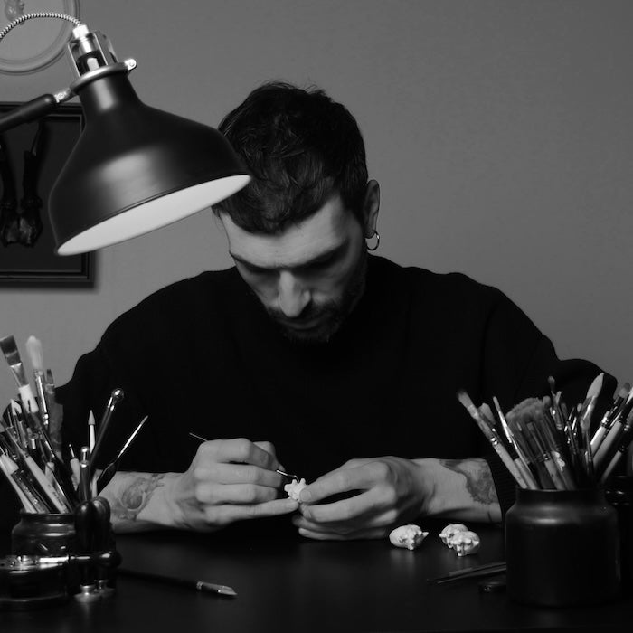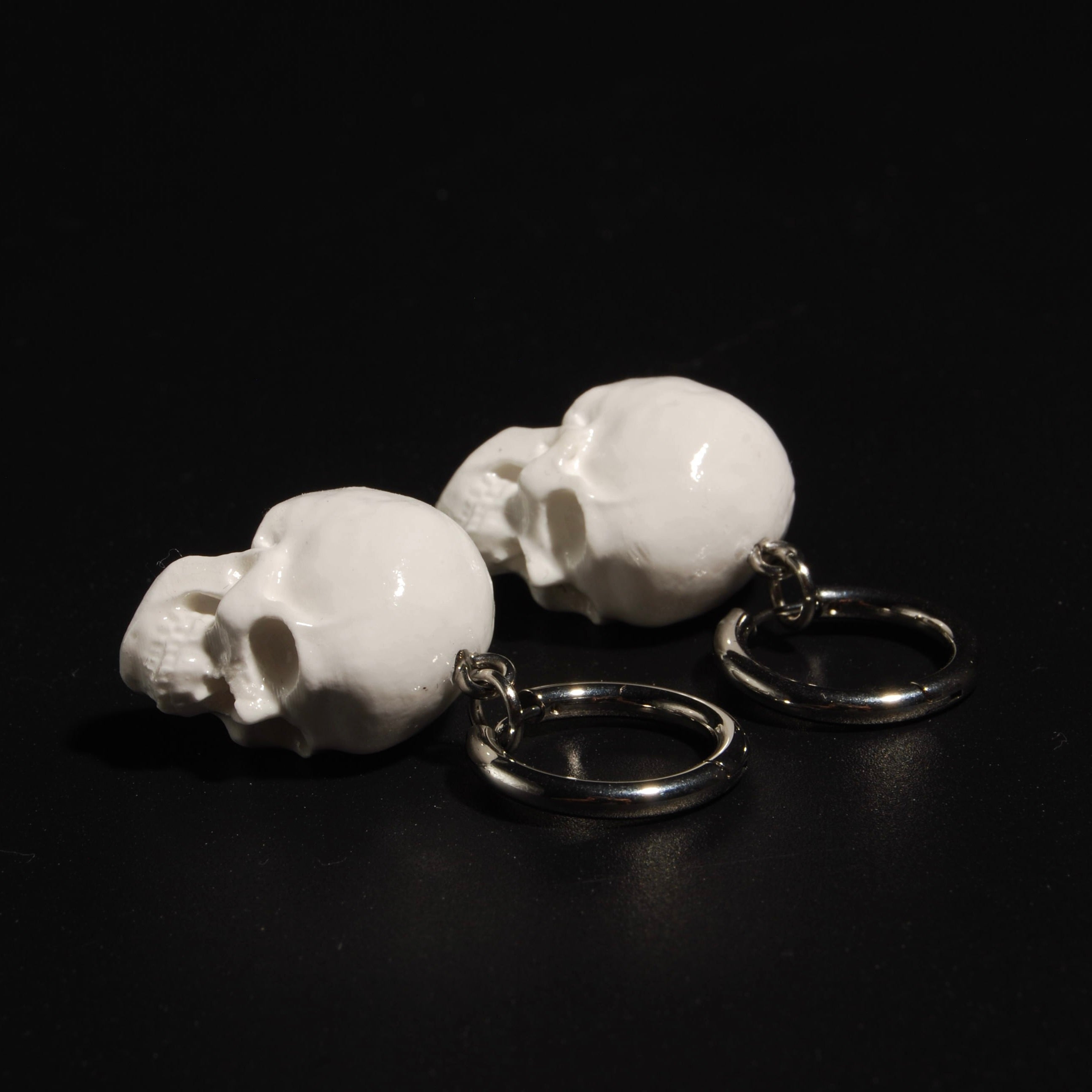 Bianco porcellana, essenziale ed elegante: il teschio diventa un emblema di luce e ombra, sospeso tra fragilità e trascendenza.